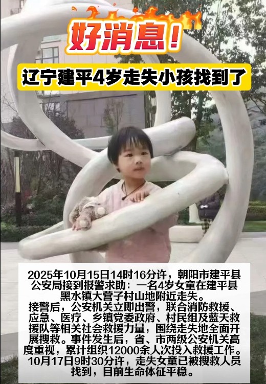 2025年10月15日14時(shí),當(dāng)“4歲女童走失”的警情從遼寧建平傳出,一場跨越地域與身份的愛心接力就此啟程,最終以“生命體征平穩(wěn)”的消息畫上圓滿句點(diǎn)。這不僅是一次搜救的成功,更是一幅“一方有難八方支援”的生動(dòng)畫卷。